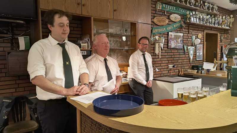 einigen gezielten Schlücken "Zielwasser" gelang es schließlich, das Bild von SM Bernd Schönhoff mit chirurgischer Präzision zu positionieren – zumindest laut dem Pegel der Anwesenden.