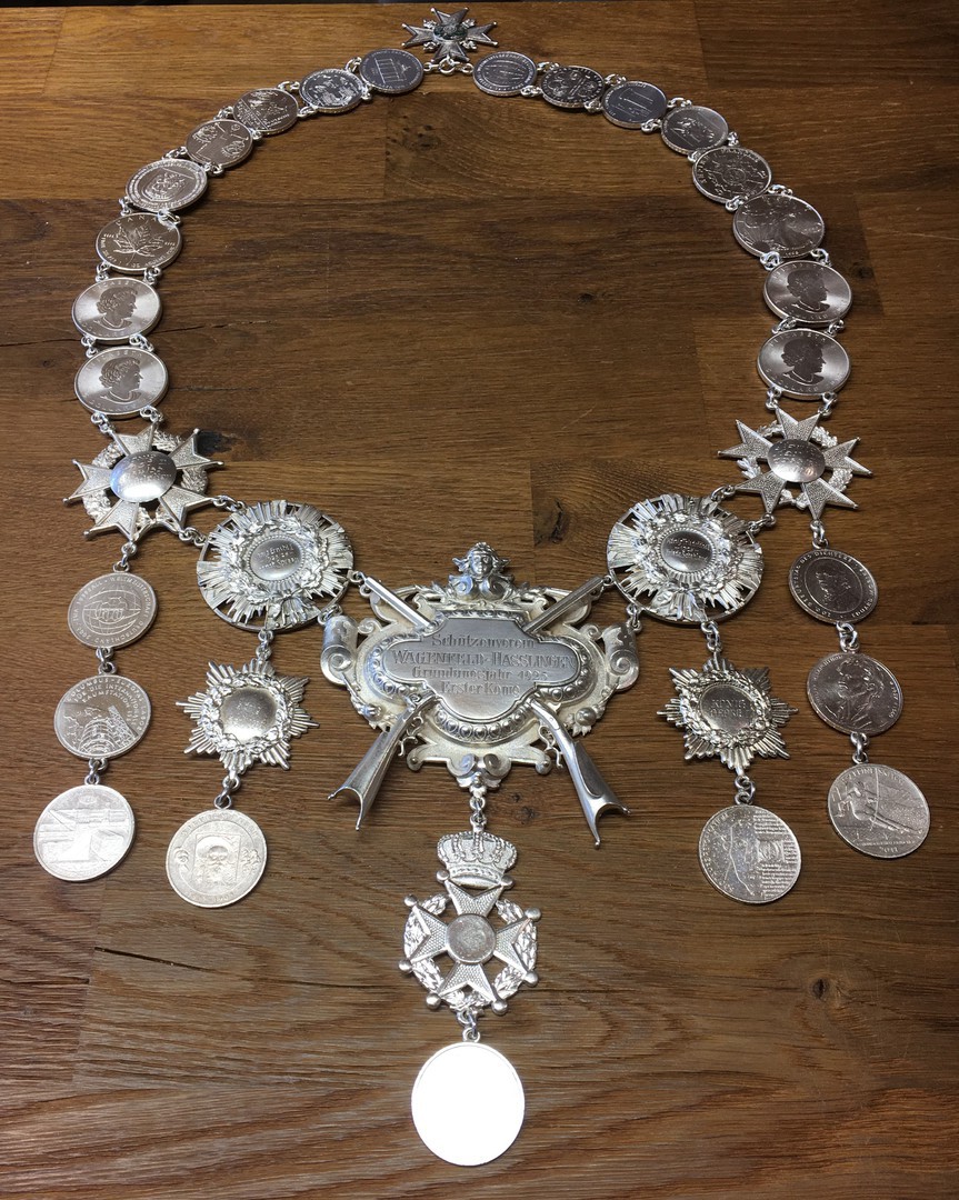 IM Erika Fenker wird erstmals die neu gestaltete Königskette unseres Schützenvereins an den Festtagen tragen. Seit der Gründung des Vereins im Jahre 1925 zierte sie alle Majestäten. Das Königsschild und die ersten Orden sind aus reinem Silber gefertigt (diese wurden auch wieder eingefügt). Im Laufe der Jahrzehnte wurde das "Schmuckstück" mit vielen Orden in diversen Ausführungen ergänzt. Diese haben im Laufe der Zeit aber doch gelitten und wirkten unansehnlich. Schon vor Jahren befasste sich der Vorstand mit einer Neugestaltung der Kette. Die Könige und Königinnen der letzten Jahre gaben auch schon Silbermünzen zur Anfertigung als Königsorden in Auftrag. Ehemalige Könige, die noch nicht über eine "silberne Königsmünze" verfügten wurden zwecks Änderung angesprochen. Fast alle beteiligten sich und ließen eine Münze fertigen. In den letzten Wochen ging es dann an die Arbeit. Jetzt ist sie fertig "unsere neue alte Schützenkette" mit viel Platz für Majestäten der nächsten Jahre. Die alten Königsorden werden einen gebührenden Platz im Haßlinger Schützenhaus finden.
